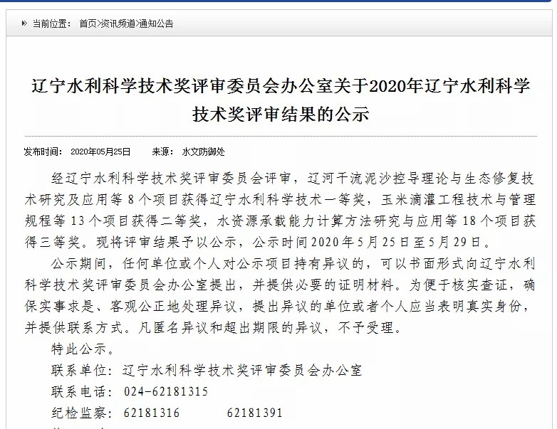 5月25日,2020年辽宁水利科学技术奖评审结果公示,水科院及下属江河设计院公司、监理公司完成的9项科技成果获奖。