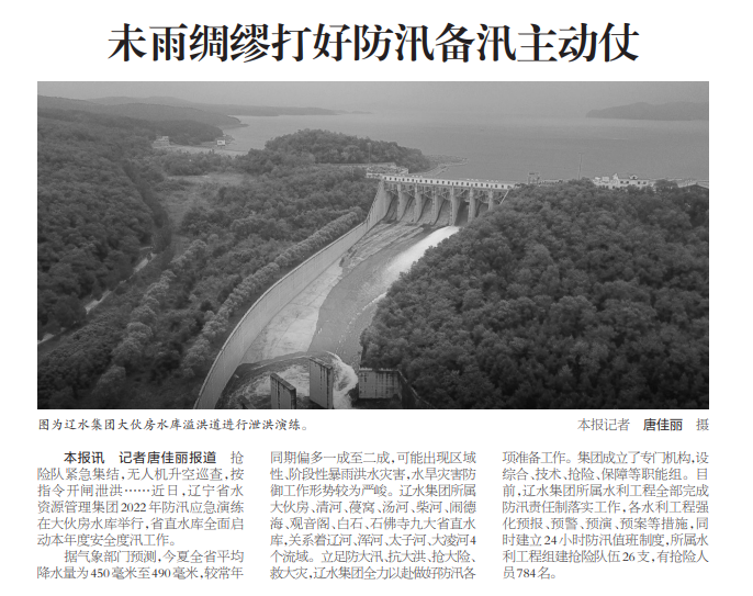 随着辽宁全面进入汛期,集团以高度的政治自觉和责任担当,扎实履行国企社会责任,统筹调度,所属各水利工程强化预报、预警、预演、预案等措施,做好各项防汛准备,先后被辽宁日报、辽宁广播电视台、辽台北斗融媒、东北新闻网、辽宁国企先锋号等各大主流媒体报道。